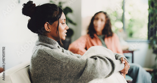 Therapy, discussion and psychologist with patient on sofa in office for mental health support. Counseling, help and psychiatrist talking to woman with depression treatment with healing at clinic.