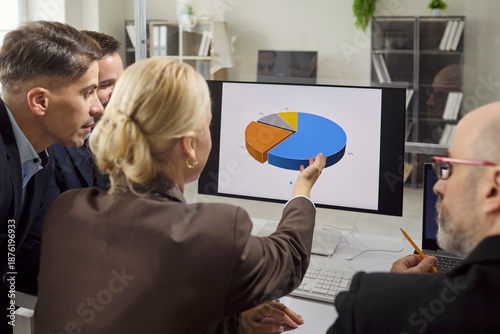 Businesswoman and businessmen analyze data chart. Colleagues review a piechart on a monitor, discussing trends and strategy in a bright office. Teamwork and analytics guide smart decisions.