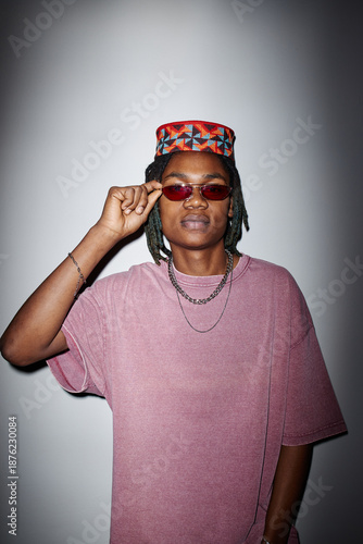 Portrait of young adult Black man adjusting sunglasses while wearing patterned hat, standing against plain background, expressing confidence and individuality in second hand fashion