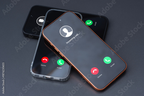 Incoming call interface displayed on several modern smartphones stacked together. Concept of mobile communication, customer support, hotline service and call center.