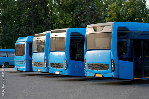 A row of buses lined up at the city electric bus terminal, rear view