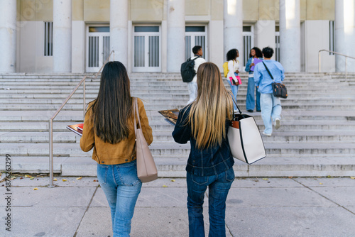 Multiracial group of students walking up stairs of a university building, carrying books and bags, heading to class