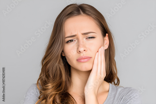 Młoda kobieta z bólem zęba trzyma policzek, problem stomatologiczny i dyskomfort, wrażliwość oraz potrzeba wizyty u dentysty.