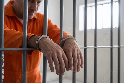 Male prisoner in orange jumpsuit with handcuffs in jail cell