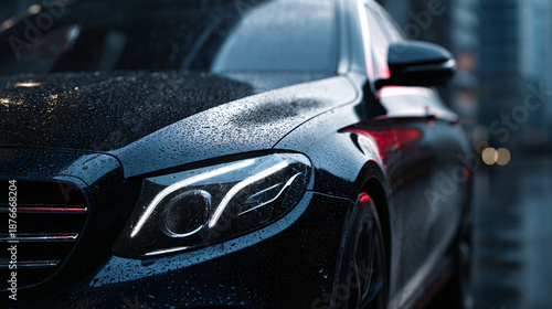 Close-up of a wet luxury car with illuminated headlights in an urban setting.