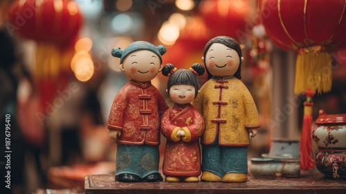 Chinese traditional lunar new year Spring Festival celebration in Asia. Three figurines of a family of three, likely representing a family.