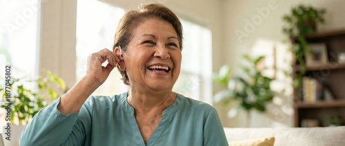 Senior Hispanic woman adjusting hearing aid, laughing joyfully at home Concept of hearing loss, accessibility, and active aging