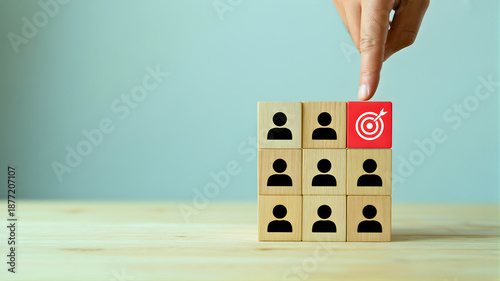 Selecting the ideal candidate by targeting the right person from a group of potential employees with a bullseye icon