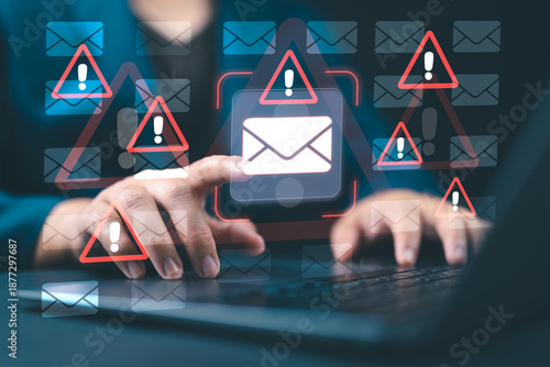 Email security software detecting phishing or scam emails with warning alerts, as a businessperson touches the email icon to delete malicious messages and protect sensitive data.