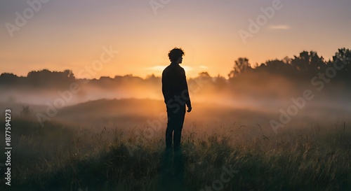 #855482945A person stands as a silhouette atop a mountain peak, overlooking a vibrant sunset that paints the sky with hues of red and blue.