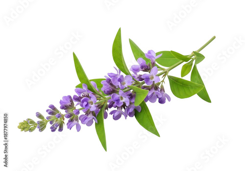 Delicate purple flowers on a green stem against a black background