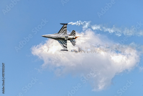 Wojskowy odrzutowy samolot myśliwski wystrzeliwujący flary podczas pokazów lotniczych