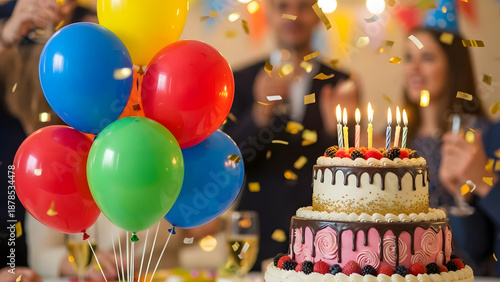 Birthday party with colorful balloons, candles on cake, festive decorations, blurred background