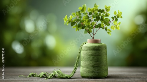 Green spool of thread with delicate threads unwinding, transforming into vibrant leaves and branches, placed on a wooden surface with a blurred green background creating a natural atmosphere