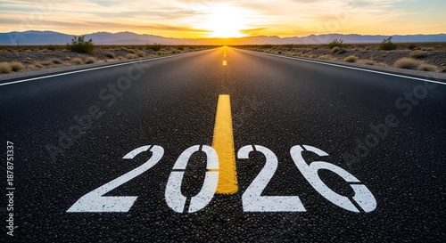 2026 painted on desert highway at sunrise, symbolizing new year, journey, future, and opportunity with golden light