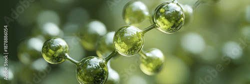Macro View of Abstract Green Molecular Structure Symbolizing Biotechnology Organic Chemistry and Natural Science Research on a Blurred Botanical Background