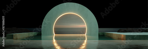 Minimalist Modern Architecture Featuring a Glowing Golden Circle Portal Overlooking a Calm Ocean at Night with a Luxury Infinity Pool and Concrete Stone Plinths