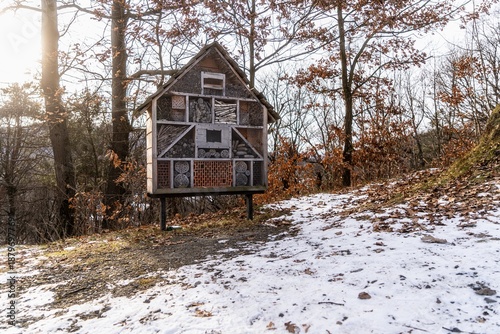 Drewniany domek dla owadów ustawiony na palach w zimowym lesie, element ochrony przyrody i bioróżnorodności.