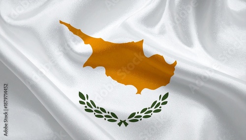 Oil-paint textured illustration of the Cyprus flag, white field with copper island silhouette and green olive branches, flowing fabric motion, soft folds, bold contrast, expressive brush strokes.