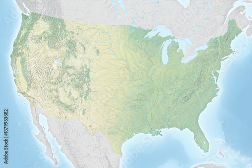 Relief map of the contiguous United States showing physical geography, elevation, mountain ranges, rivers, and coastlines with surrounding North American countries