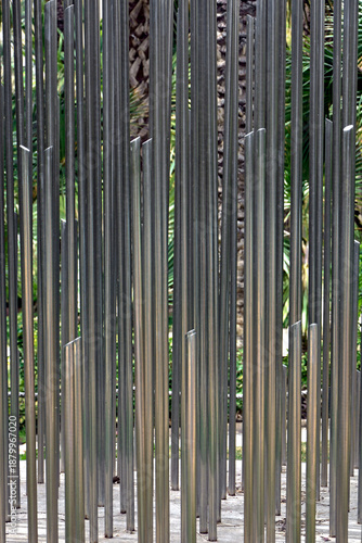 rury ze stali nierdzewnej ustawione pionowo, dekoracja ze stalowych rur w ogrodzie, group of stainless steel pipes arranged vertically like garden sculptures