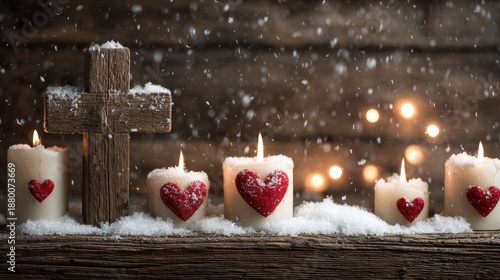 Glowing white candles behind a wooden cross with red hearts in snow set against an antique wood background suitable for Christmas Easter and religious themes with room for text