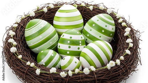 Beautiful green and white easter eggs in a nest with small white flowers
