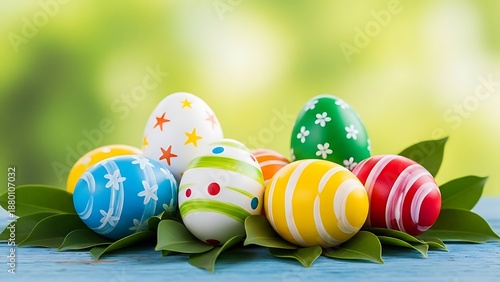Beautifully decorated easter eggs arranged on a bed of green leaves on a wooden surface