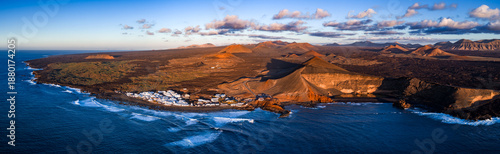 Aerial view of Lanzarote southwest coast at golden hour, Atlantic surf meets dark volcanic shore, Timanfaya cones and ash fields rise, El Golfo road runs by a whitewashed village