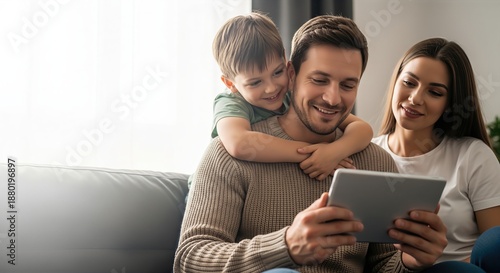 Happy young family with a small son sitting on a sofa and using a digital tablet together in a bright living room at home.