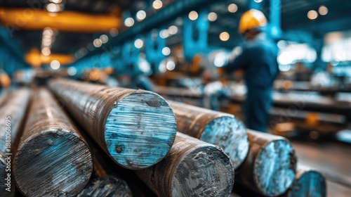 Close up of round steel metal bars in a manufacturing factory with worker in bokeh background