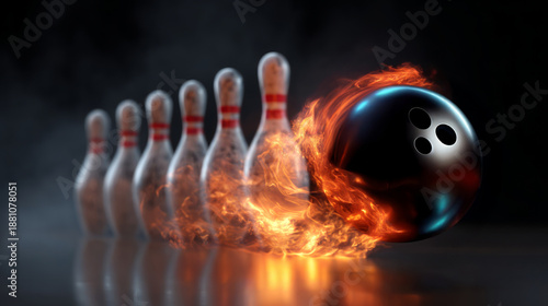 Bowling ball on fire heading toward pins in dramatic motion.