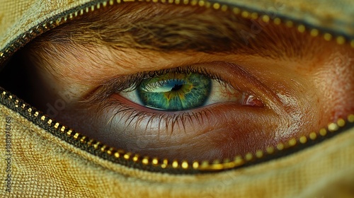 Close-up eye peeking from a zippered canvas
