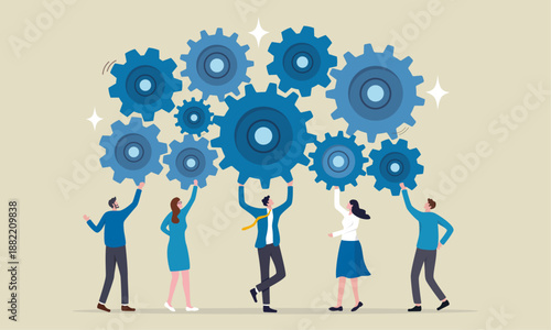 Teamwork and System Efficiency Vector, Business Professionals Managing Interlocking Gears for Collaboration and Strategy Graphics