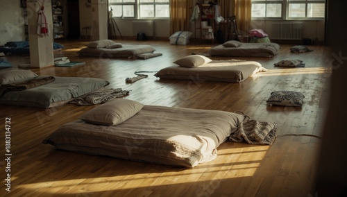 Interior scene showing sleeping arrangements on wooden flooring for refugees or those experiencing homelessness