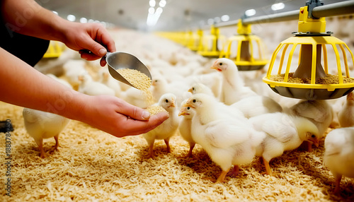 Farmer feeding young chickens inside a large poultry farm. Concept of livestock feeding, animal welfare, poultry production, and agriculture industry.