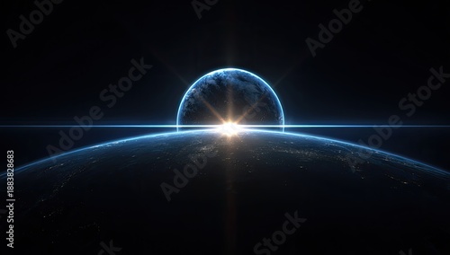 Glowing planet rising above a curved horizon, with beams of light piercing the dark sky