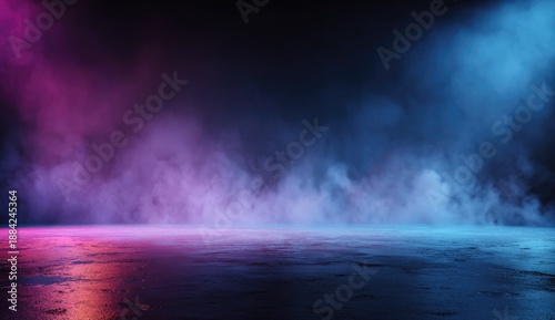 Moody abstract scene with vibrant pink and blue lighting, shrouded in atmospheric smoke