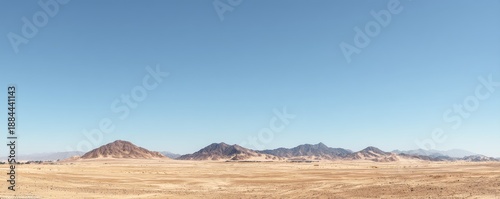 Wide empty desert landscape with vast sandy plain and distant rocky mountains under a clear blue sky, ideal for minimal natural backgrounds and environmental openness concepts