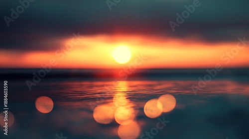 Serene sunset over calm ocean waters with vibrant orange and yellow hues reflecting on the surface creating a peaceful atmosphere