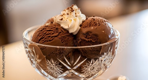 Indulgent scoops of rich chocolate ice cream crowned with fresh whipped cream served elegantly in crystal glassware.