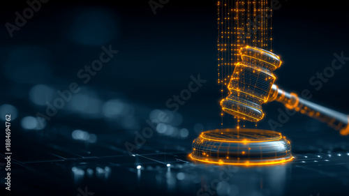 Digital gavel formed by data particles symbolizing justice, regulation and modern legal technology.