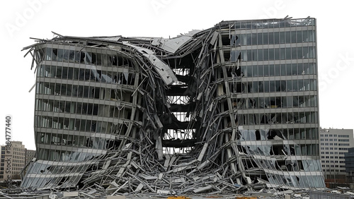 Damaged office building with destroyed exterior and debris isolated on a transparent background destruction
