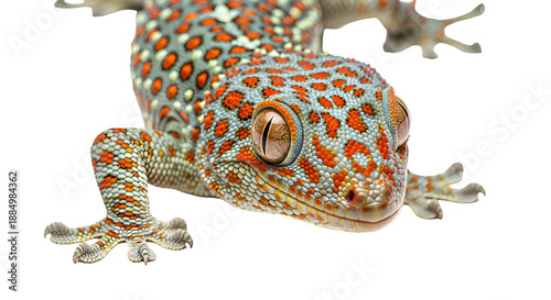 A close-up of a vibrant gecko with orange and blue spots on its skin, showcasing its detailed texture and eyes, presented in a photographic image from a direct viewpoint.