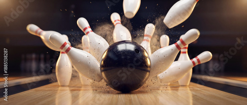 Bowling Ball Crashing into Pins, Strike and Success Concept