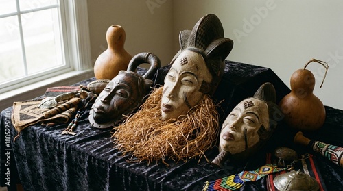 Collection of diverse African tribal masks and artifacts displayed on dark velvet cloth