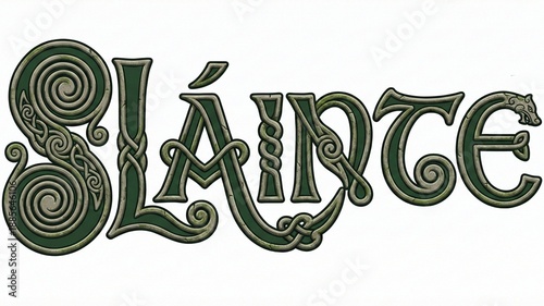 Celtic knot style "Sláinte" typography. Green Gaelic cheers text with intricate Irish or Scottish knotwork ornament