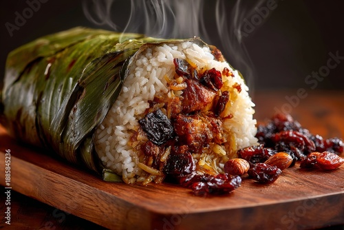 Lamprais wrapped in banana leaf, topped with dried cranberries and nuts, served on wooden cutting board. Concept of rice meat wrapped Sri Lankan cooked dish with warm lighting.