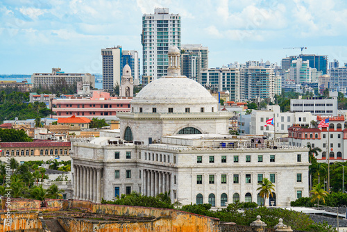 Aerial view of the Capitol of Puerto Rico with the modern San Juan skyline