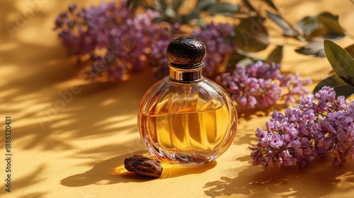 Top view of elegant perfume bottle with flowers and oud over yellow background. Cosmetics, fragrance and perfumery concept